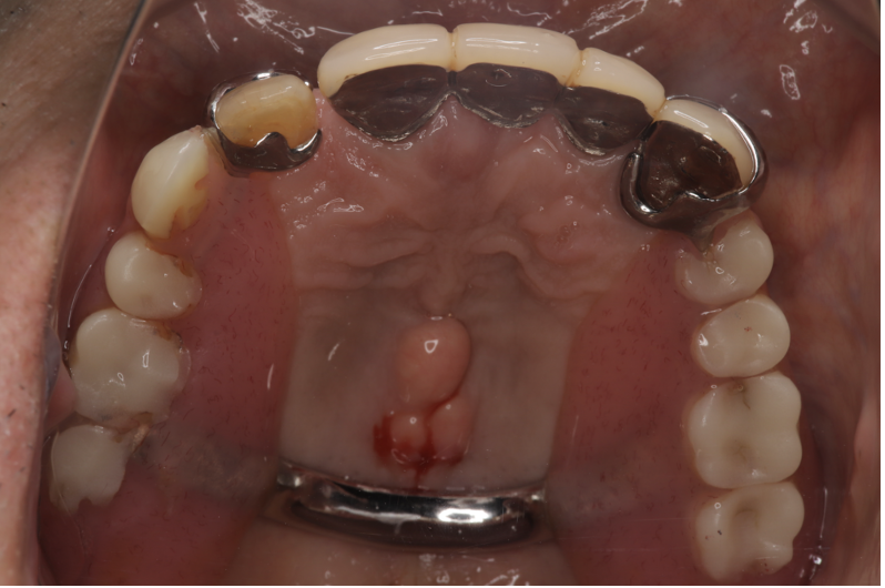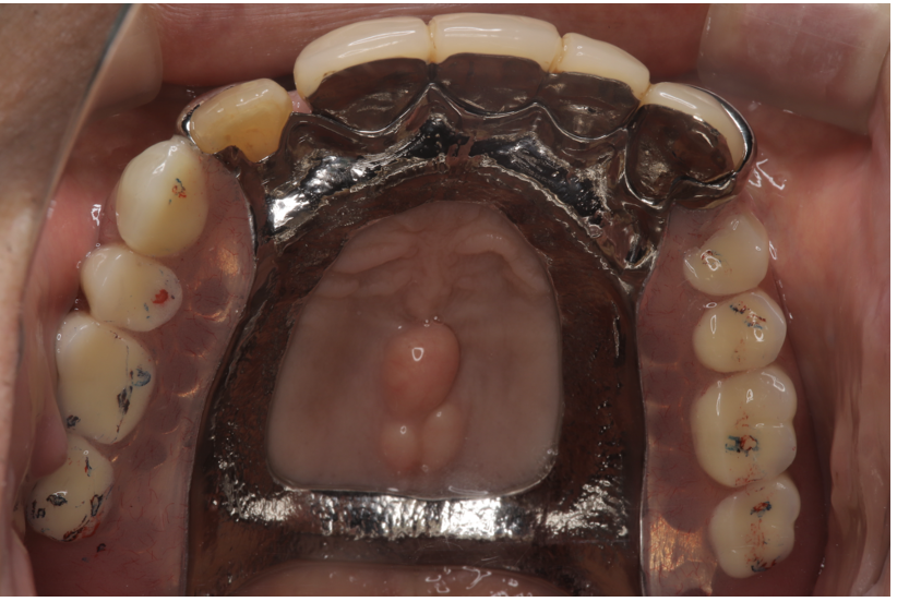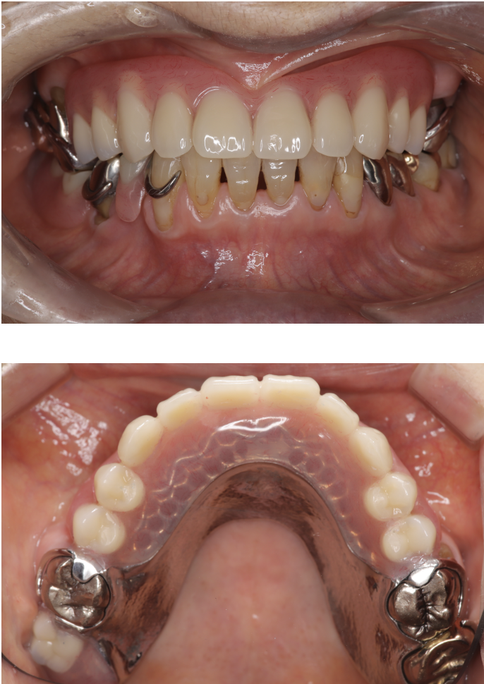 | 備考 | 院長より 上の歯が残り5本しか残っていない状況になっています。入れ歯がシーソーの動きをしてしまい痛みも出易い状況です。 金属床で剛性を高くして、少しでも適合を良くし、残っている歯の負担をラグビーでスクラムを組むように固定して減らし、入れ歯のたわみを減らし、安定を良くして、残っている歯をガチッと固定して守っています。 |