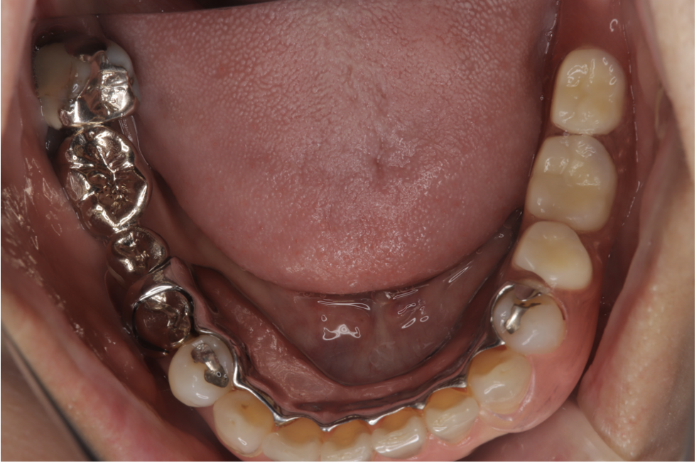 | 備考 | 院長より 下の一番奥の部分が、3本連続欠損の状況になっています。入れ歯がシーソーの動きをしてしまい痛みも出易い状況です。金属床で剛性を高くして、少しでも適合を良くし、残っている歯の負担をラグビーでスクラムを組むように固定して減らし、入れ歯のたわみを減らし、安定を良くしています。そして、残っている歯をガチッとした構造で守っています。 |