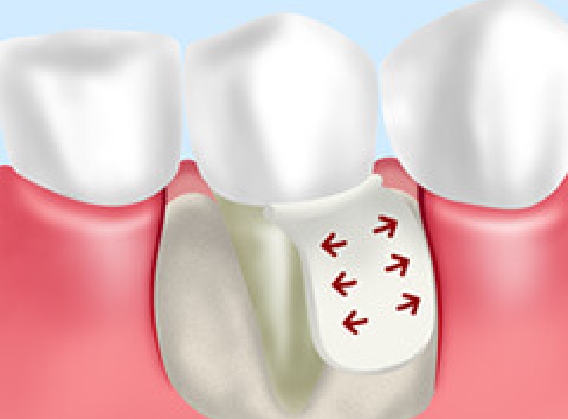 歯周病によって溶けてしまった歯周組織を再生する治療です。歯周病に冒された部位を除去し、メンブレンという特殊な膜を挿入し、歯肉が入らないようにスペースを確保して歯周組織の再生を図ります。